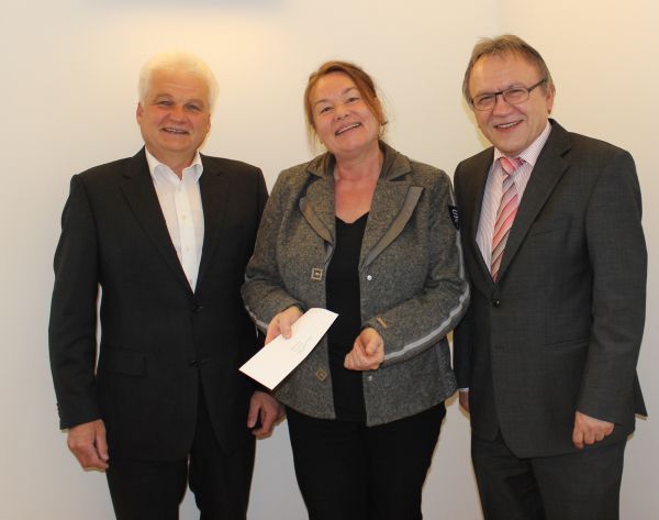 Foto: Erich Pipa (rechts im Bild) überreicht Christa und Bernhard Acker einen Zuschuss zur Sanierung des denkmalgeschützten Wohnhauses.