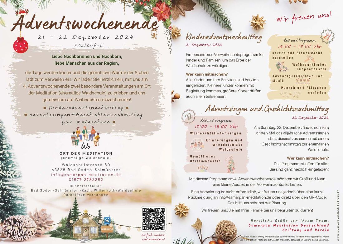 Das Team der gemeinnützigen Stiftung und des Vereines Samarpan Meditation Deutschland e.V. lädt alle NachbarInnen und Interessierten zu gleich zwei Programmen an den Ort der Meditation (ehemalige Waldschule) am 4. Adventswochenende ein, um auf ein freudvolles Weihnachten einzustimmen.