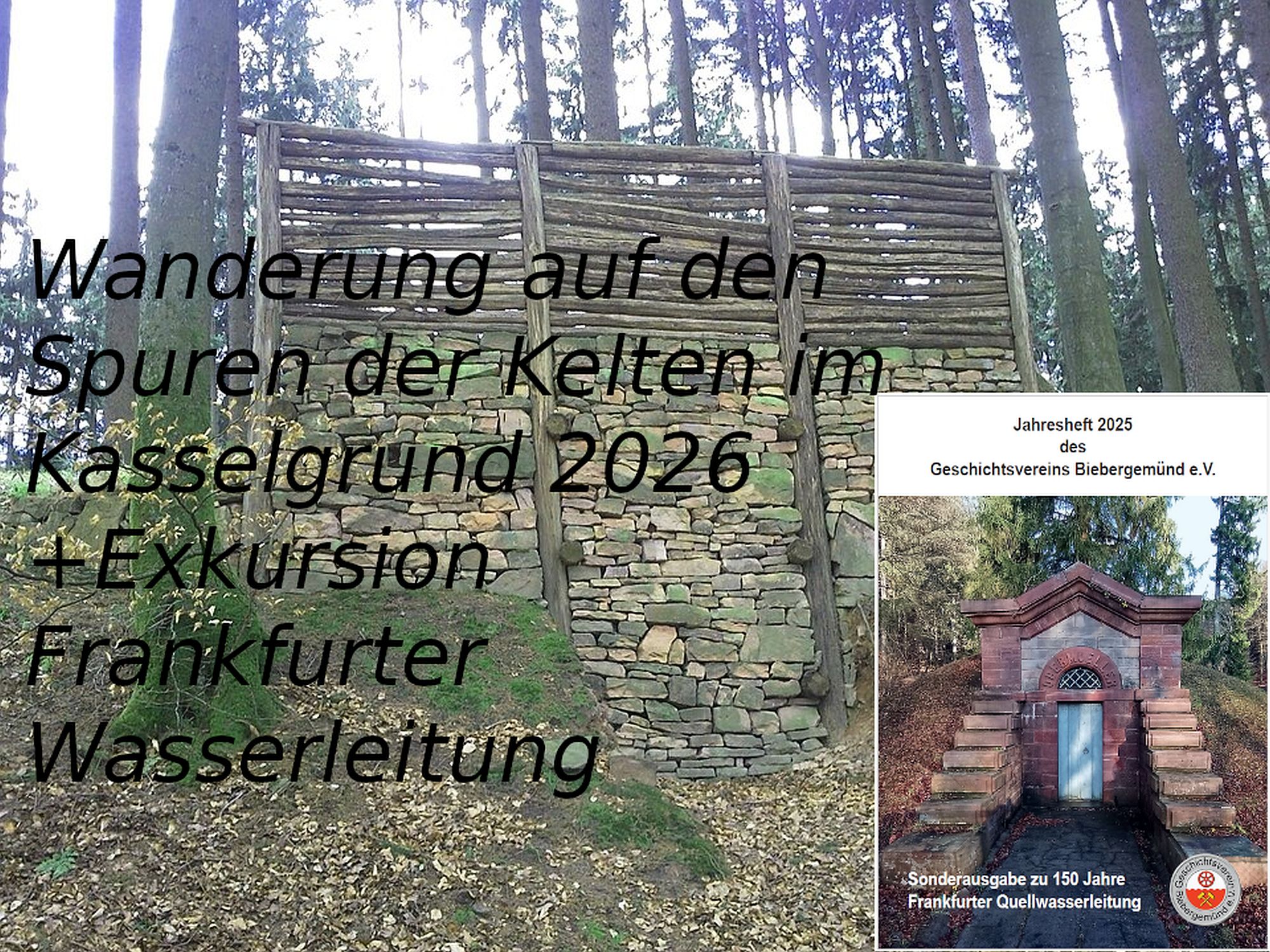 Besonderer Höhepunkt der Wanderung dieses Jahres wird neben dem gewohnten Aufstieg zur "Altenburg" eine Erzählung von Josef Acker über die Frankfurter Wasserleitung sein. Außerdem können Interessierte ausnahmsweise dieses Jahr neben den allseits beliebten Informationsflyern zum Kulturweg "Kelten im Kasselgrund" auch Ausgaben des Jahreshefts des Geschichtsvereins Biebergemünd 2025 zum Thema "Sonderausgabe zu 150 Jahre Frankfurter Quellwasserleitung" erwerben. Eine Empfehlung, nicht nur für Interessierte zum Thema "Frankfurter Wasserleitung" und aufgrund seiner praktischen Form für jede Rucksackgröße geeignet. Bitte entsprechendes (für eine Wanderung ausgelegtes) Schuhwerk mitnehmen. Für freuen uns über ein reges Interesse.