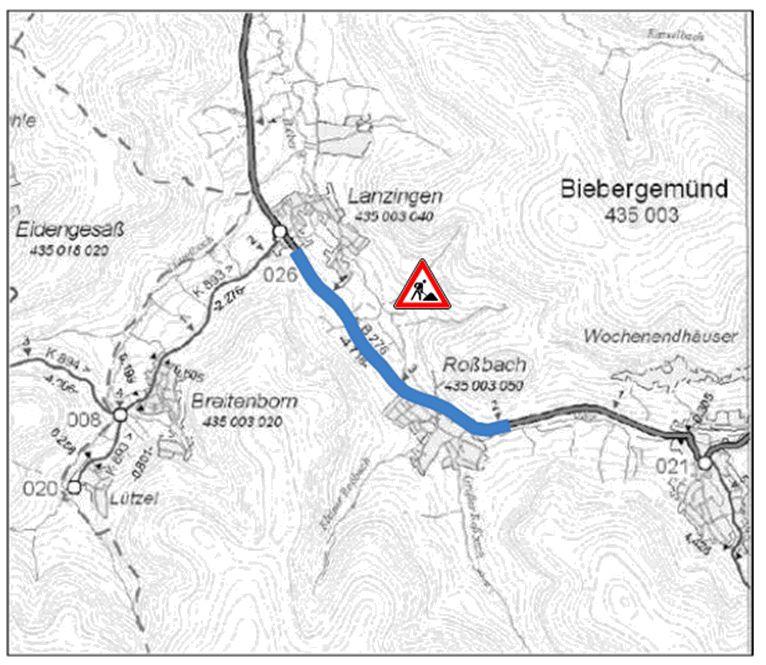 Zwischen den beiden Biebergemünder Ortsteilen Roßbach und Lanzingen muss ab Montag, den 11.07.2016 die Fahrbahndecke der Bundesstraße (B) 276 grundhaft erneuert werden.