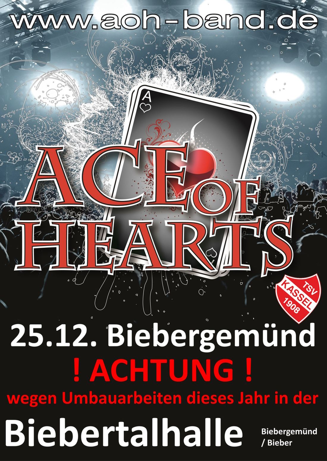 Auch dieses Weihnachten ist es wieder soweit: Der TSV Kassel veranstaltet den traditionellen Weihnachtsrock in Biebergemünd! Am 25.12.2024 ab 20:30 heisst es dann wieder: Bühne frei für Ace of Hearts. Der TSV 08 Kassel freut sich auch dieses Jahr wieder den absoluten Party - Kracher am ersten Weihnachtsfeiertag begrüßen zu dürfen.