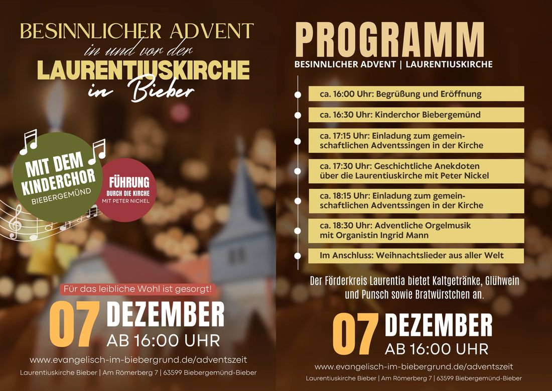 Anders als in den vergangenen Jahren lädt die Evangelische Kirchengemeinde Biebergemünd gemeinsam mit dem Förderkreis Laurentia zum ‚Besinnlichen Advent in und vor der Laurentiuskirche‘ im Biebergemünder Ortsteil Bieber ein.