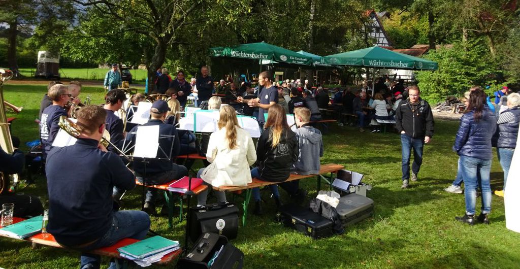 Begeistert forderten sie noch Zugaben, die natürlich gerne gespielt wurden. Zu später Stunde fuhren die Musiker mit zahlreichen Fans des MVK mit dem Bus zurück nach Kassel. Gleich Montags ging es mit dem Bratfest auf der Mühlwiese an der Obermühle weiter. Der anfängliche Regen verzog sich am Nachmittag und viele Besucher fanden sich rund um das große Lagerfeuer ein. Die Organisatoren stellten sich kurzerhand auf die kühlen Temperaturen ein und boten neben den kalten Getränken auch Glühwein an, der reißenden Absatz fand. Am Nachmittag sorgte das Jugendorchester unter Leitung von Markus Fischer mit viel Blasmusik für gute Unterhaltung und die zahlreichen Besucher ließen sich den leckeren Hackbraten, sowie selbstgebackenen Kuchen schmecken. Auch für die Kleinen wurde eine Bastelecke angeboten, bei dem sie Leinentaschen bemalen und Glitzerwindräder basteln konnten.