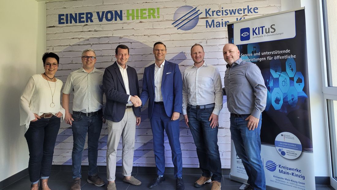 Von links: Sabine Kneipp, Mirco Neidhardt (Projektverantwortliche Birstein), Fabian Fehl (Bürgermeister Birstein), Oliver Habekost (Geschäftsführer Kreiswerke Main-Kinzig), Sascha Kling (IT-Teamleiter Kreiswerke Main-Kinzig) und Zlatko Zukic (Key account KITuS Kreiswerke).