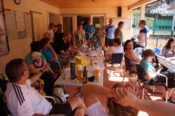 Anschließend wanderte die gute Stimmung von den Plätzen auf die Terrasse des Vereinsheims, auf der sich etliche Mitglieder und Interessierte eingefunden hatten. Grillmeister Dirk Frank sorgte für leckere Steaks und Würstchen. Insgesamt war es ein gelungener Tag mit viel Spaß bei allen Beteiligten. Wenn auch etliche Mitglieder sich nicht sportlich betätigten, so schauten doch viele im Verlauf des Tages neugierig vorbei, so dass die Anlage immer gut besucht war. Das Signal an diesem Tag war eindeutig: Alle freuen sich, dass es nun wieder mit Tennis losgeht!