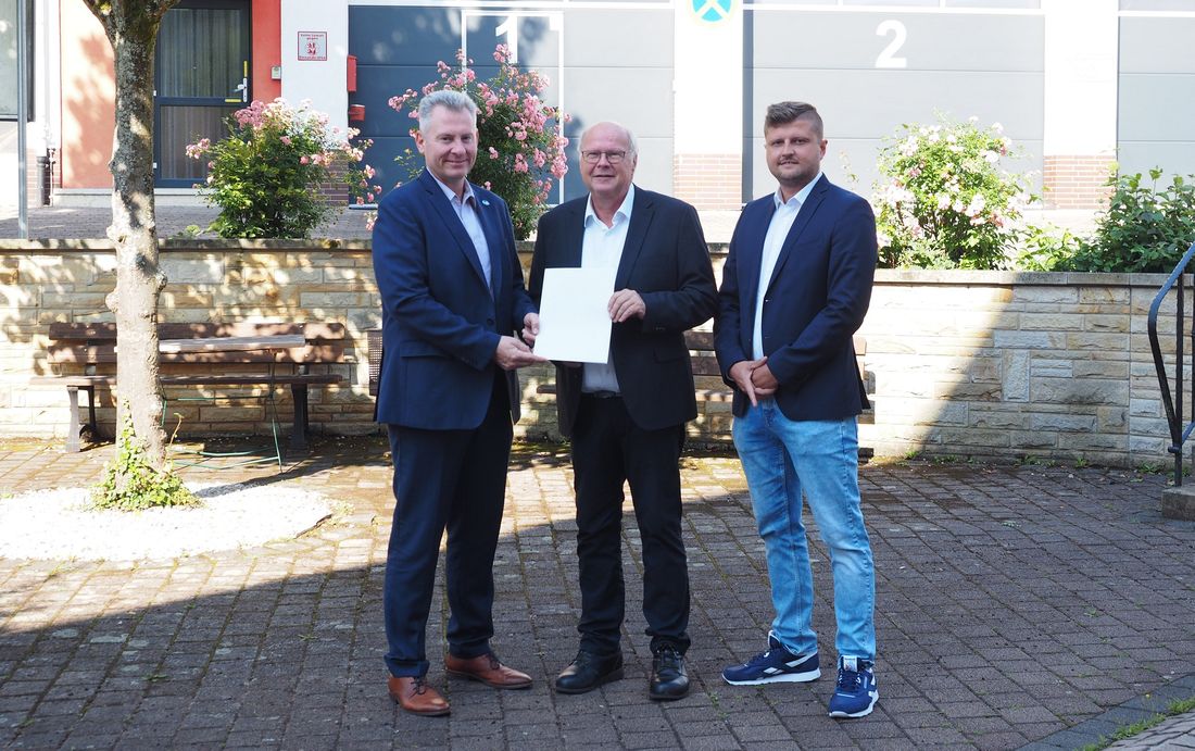 Der Erste Kreisbeigeordnete Andreas Hofmann (links) übergab Brachttals Bürgermeister Wolfram Zimmer (Mitte) im Beisein von Vegard Schüch, Amt für Umwelt, Naturschutz und ländlicher Raum, einen Förderbescheid für die Dorfentwicklung der Gemeinde am Südhang des Vogelsbergs.