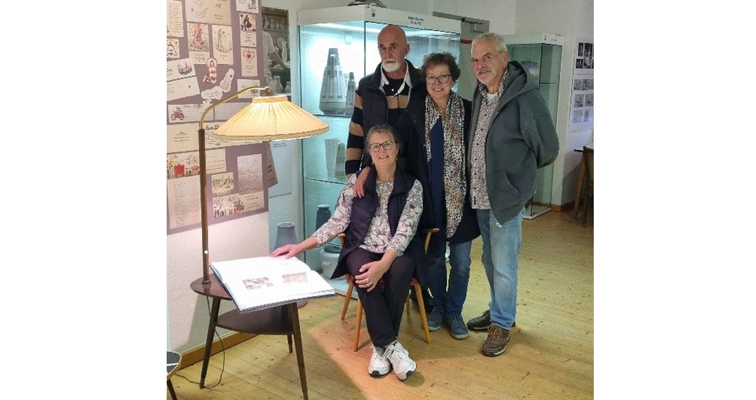 Das Ehepaar Mueller und ihre Gastgeberfamilie Elsesser beim Besuch der Fesca Ausstellung im Brachttal Museum (von links nach rechts).