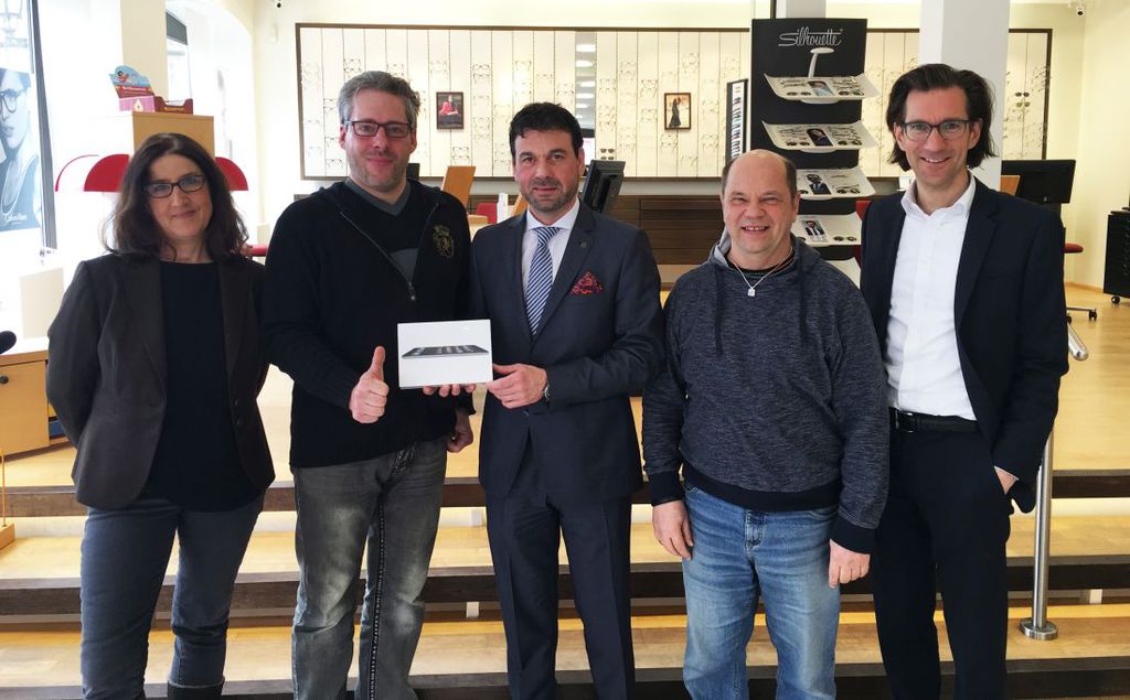 Foto (von links): Geschäftsführerin des Stadtmarketings, Andrea Weber, Uwe Bender, der glückliche Gewinner, Peter Vahlensieck, Schatzmeister des Stadtmarketingvereins, Ralf Puppe, der Präsident des HGV, und der stellvertretende Vorsitzende des Stadtmarketingvereins Volker Meyer.