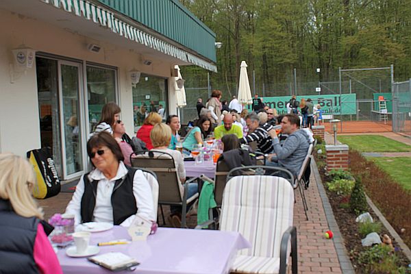 Die Anlage mit den frisch vorbereiteten Plätzen füllte sich schnell. Zahlreiche Mitglieder und viele Gäste nutzten die Gelegenheit, sei es zum Verweilen auf der Terrasse bei einem Glas Sekt oder zu ersten Schlägen auf Sand, endlich wieder.