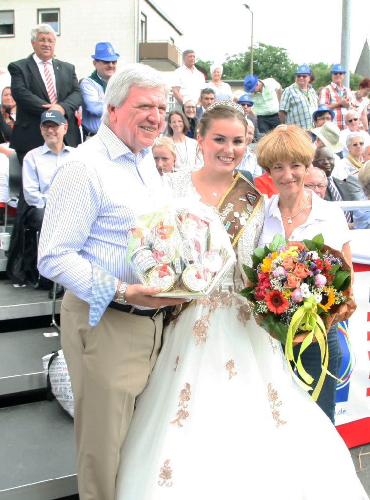 Aus einem festlich geschmückten Cabriolet heraus winkte die strahlende Königin in‘s Publikum. Viele Teilnehmer blieben vor der Ehrentribüne stehen und überreichten dem Hessischen Ministerpräsidenten Volker Bouffier Geschenke. Die hübsche Regentin ließ es sich auch in diesem Jahr nicht nehmen, ein weltoffenes und modernes Image der Region um Bruchköbel durch ein exklusives Präsent darzustellen, welches sie persönlich überreichte. "Da muss man einfach dabei sein, die Teilnahme am Hessentagsumzug ist eine der schönsten Seiten des Königinnendaseins. Mehr Erlebnis geht nicht! ", mit diesen Worten bedankte sich die beliebte Königin aus Bruchköbel beim Ministerpräsidenten.