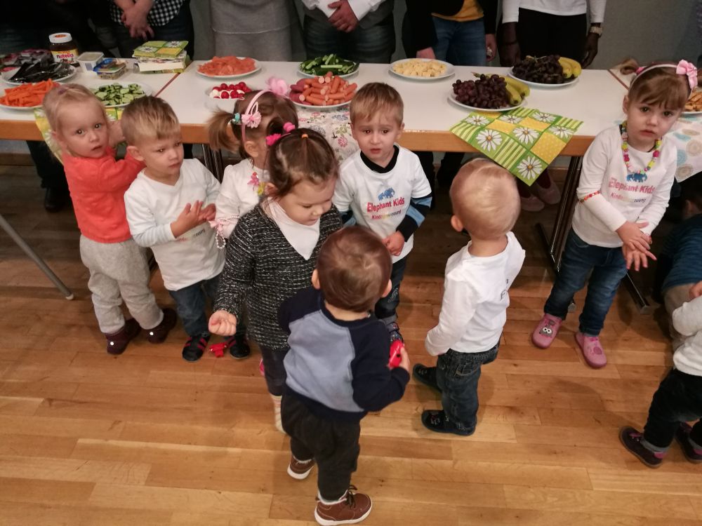 So fand sich auch der Filialleiter der Erlenseer REWE- Filiale in der Leipziger Straße, Daniel Panovski gegen 09:00 Uhr in der Erlenhalle ein und wurde herzlich, stellvertretend für die Gruppe, von Tagesmutter Cindy Ennin begrüßt. Obwohl die Protagonisten dieser Wette mittlerweile schon vier verschiedene Kindertagesstätten in Erlensee gesehen hatten, war das heute in dem kleinen Saal der Erlenhalle etwas ganz anderes. Babyschreie, Kleinkinder, die auf dem Boden umherkriechen, das war man so noch nicht gewohnt. Auch ungewohnt: Die Betreuungskräfte gingen zum Buffet und holten einige der leckeren Speisen. Obst, Gemüse, etc. Auf Kinder wartete man umsonst am Buffet! Grund: Die glücklichen Kleinen bekamen ihr „Mahl“ am Tisch serviert. Sie mussten das Gebrachte nur noch gut heißen und schon konnte das Frühstück beginnen. So ähnlich muss glückliche Kindheit aussehen!