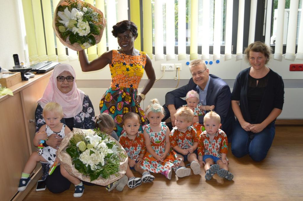 Foto: Rohna Mehrabuddin, Cindy Ennin, Bürgermeister Stefan Erb und Sandra Wunder mit den Tagespflegekindern. Auf dem Schoß des Bürgermeisters das derzeit jüngste Kind des Tagespflegeprojektes: Hannah, 7 Monate fühlt sich offensichtlich pudelwohl :-)