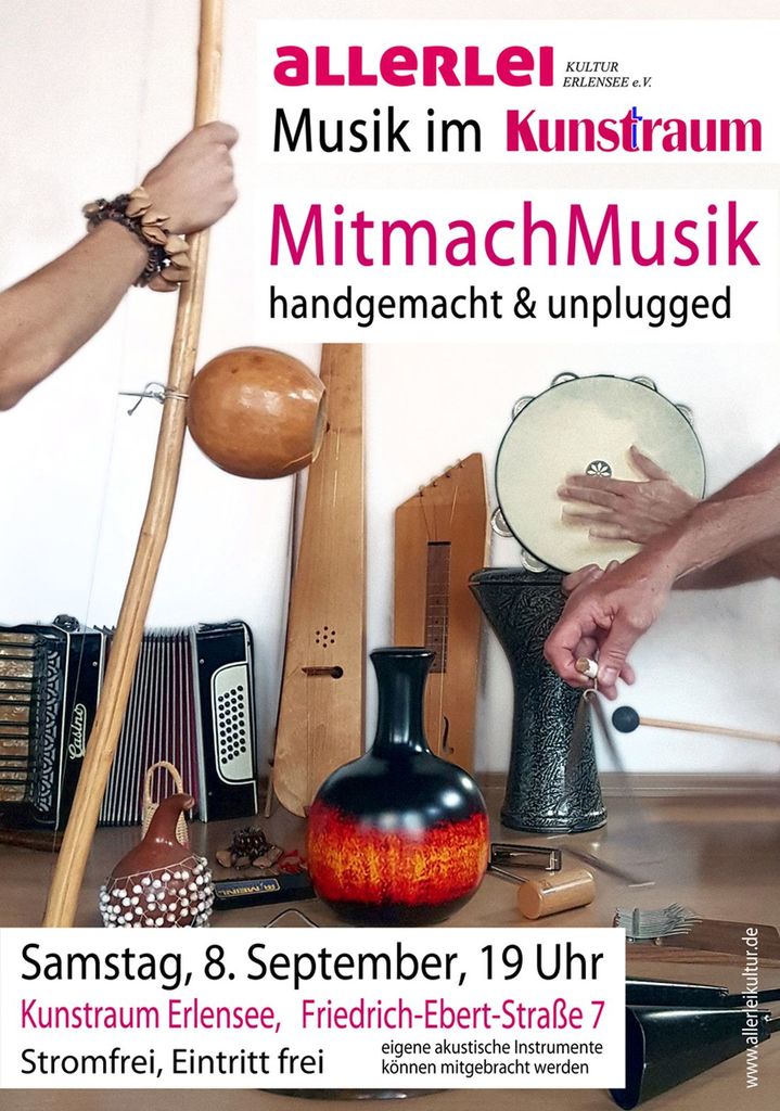 Der Kunstraum ist ein besonderer Veranstaltungsort für "Allerlei Kultur Erlensee", wo in loser Folge auch Kabarett, Lesungen und andere Kulturveranstaltungen auf dem Programm stehen. Das "Mitmachkonzert" ist ein außergewöhnliches musikalisches Experiment und verspricht viele interessante Momente. Der Eintritt ist frei. Man darf gespannt sein!