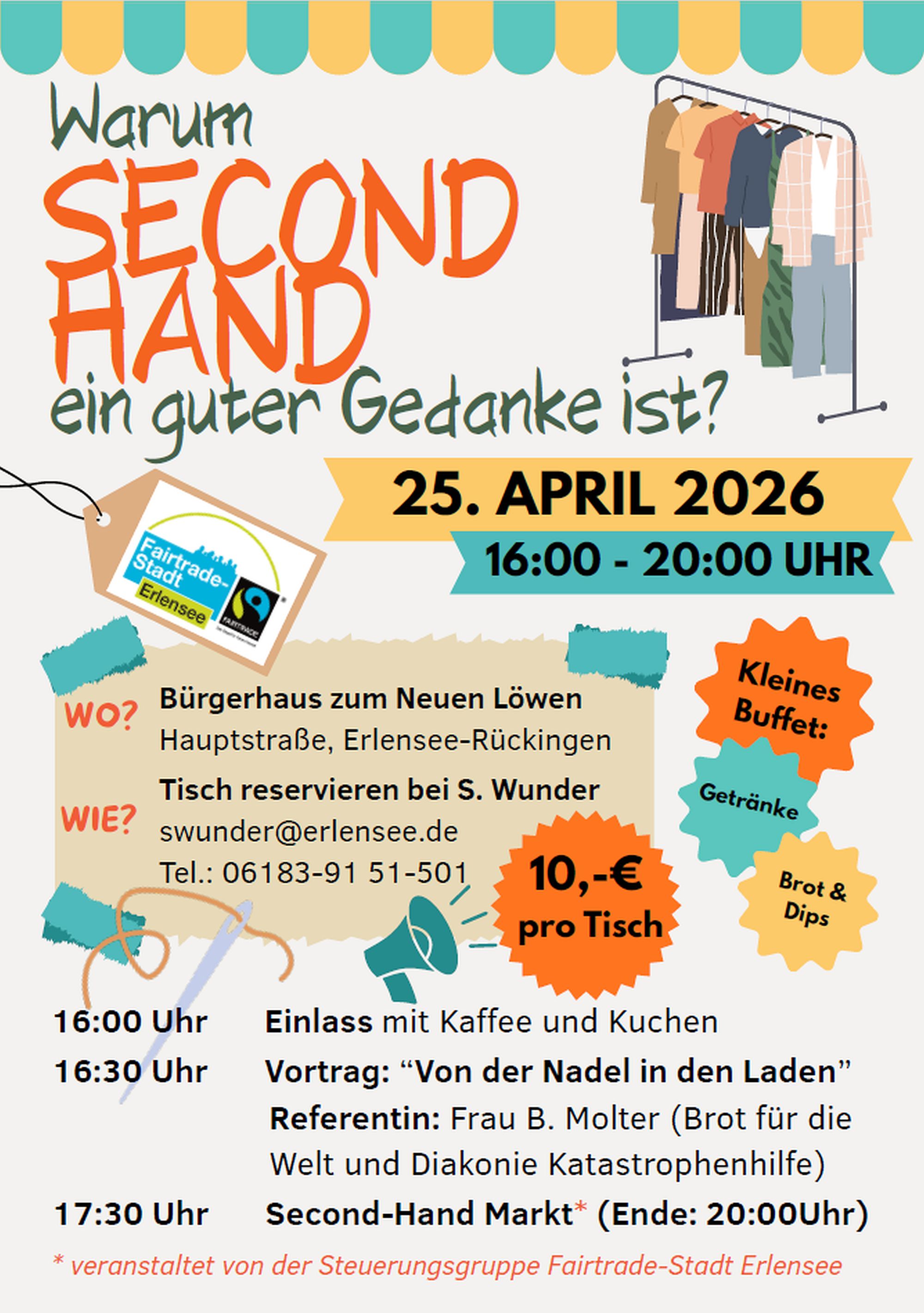 Ab 17.30 Uhr startet der Verkauf. Bis 20 Uhr gibt es die Gelegenheit, nach schönen Kleidungsstücken zu stöbern und dabei ins Gespräch zu kommen. Bei der Veranstaltung werden zusätzlich ein faires Buffet und Getränke geboten. Rückfragen und Reservierungsanfragen können bei Sandra Wunder von der Stadtverwaltung Erlensee gestellt werden: Tel.: 06183/9151-501 oder per Mail: Diese E-Mail-Adresse ist vor Spambots geschützt! Zur Anzeige muss JavaScript eingeschaltet sein!.
