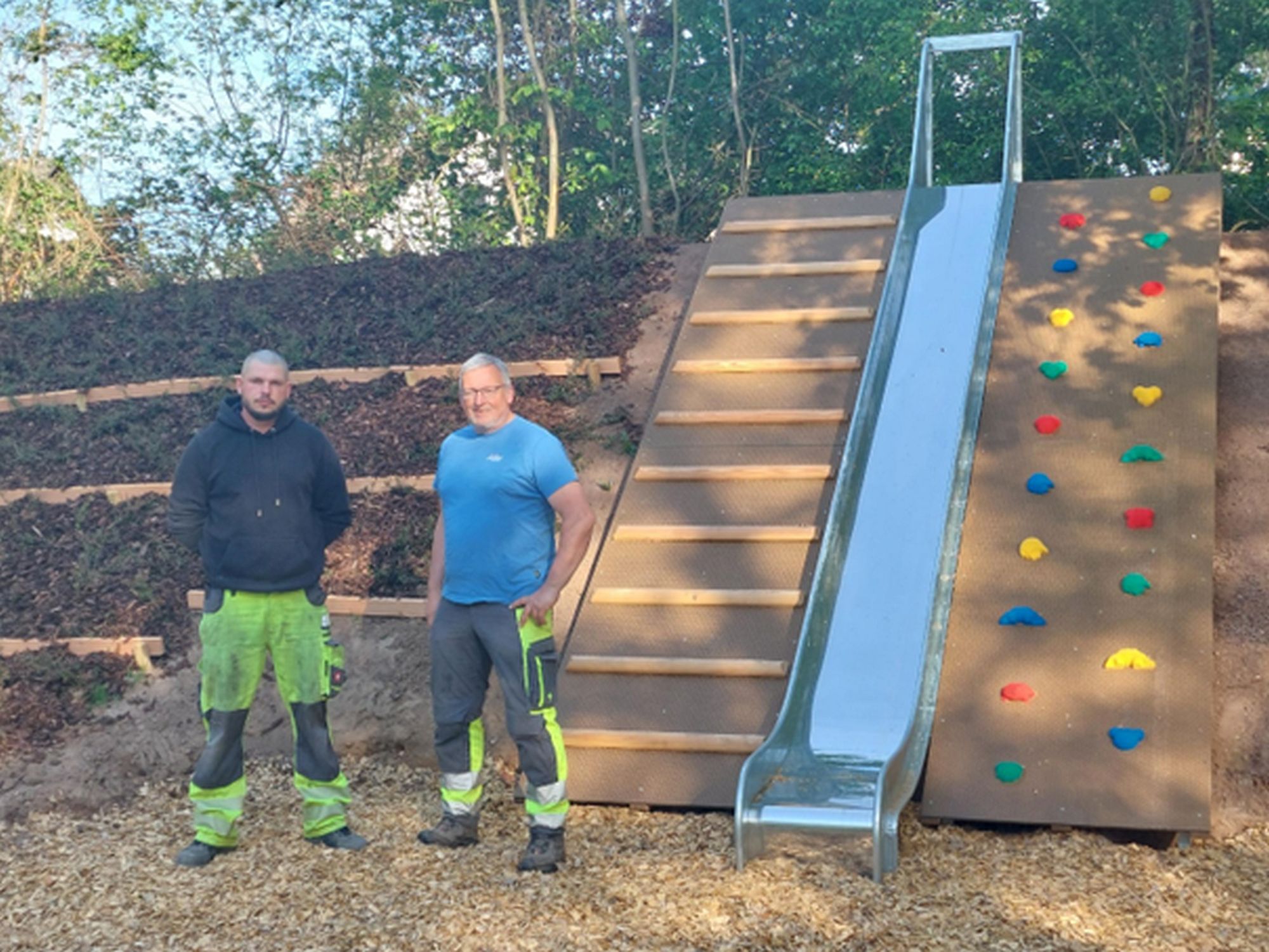Neue Hangrutsche. Wege wurden verändern, sodass ausreichend Fallschutz am Ende der Rutsche aufgefüllt werden konnte.