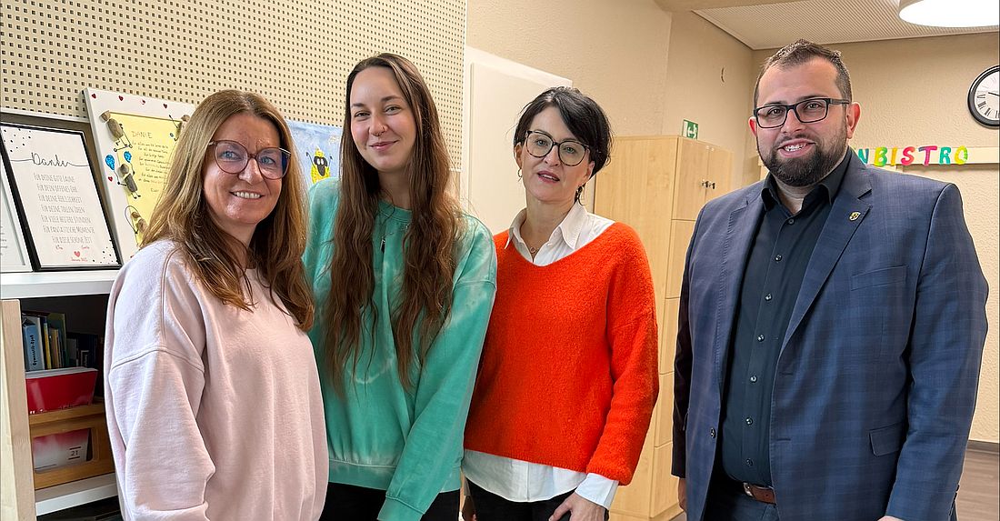 Bürgermeister Waldemar Gogel besucht mit der stellvertretenden Ordnungsamtsleiterin Heike Weber die Kindertagesstätte Zwergenland in Somborn mit Leiterin Daniela Angerer und deren Stellvertreterin Anna-Lena Frank.