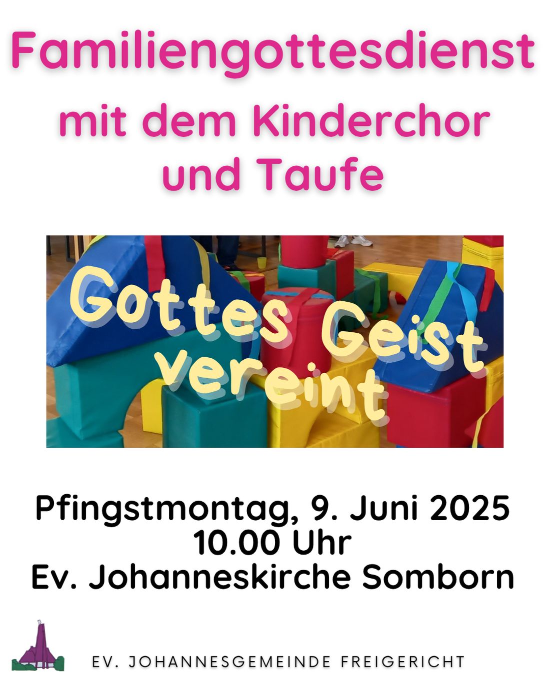 Zu einem bunten Familiengottesdienst unter dem Motto "Gottes Geist vereint" lädt die Evangelische Johannesgemeinde Freigericht am Pfingstmontag, dem 9. Juni, um 10 Uhr in die Ev. Johanneskirche in Somborn ein.