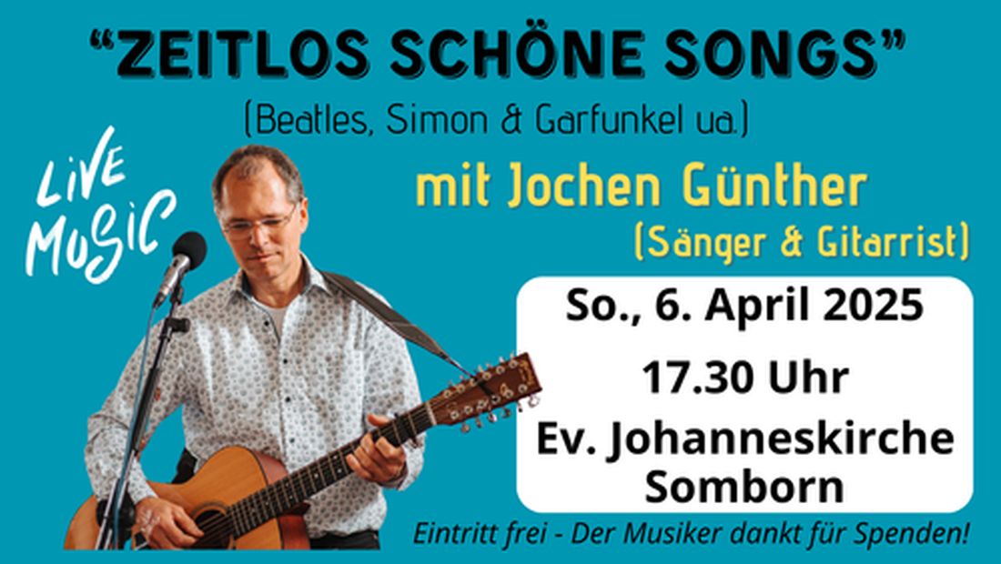 Am Sonntag, 6. April, ab 17:30 Uhr gastiert Gitarrist und Sänger Jochen Günther erneut in der evangelischen Johanneskirche von Somborn.