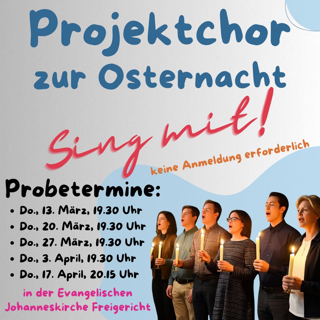 Am Donnerstag, 13. März, startet um 19.30 Uhr in der Evangelischen Johanneskirche wieder ein Projektchor, der unter der Leitung von Pfarrer Markus Wagner-Breidenbach auch in diesem Jahr wieder die Osternacht am 20. April um 5.30 Uhr mitgestalten wird.
