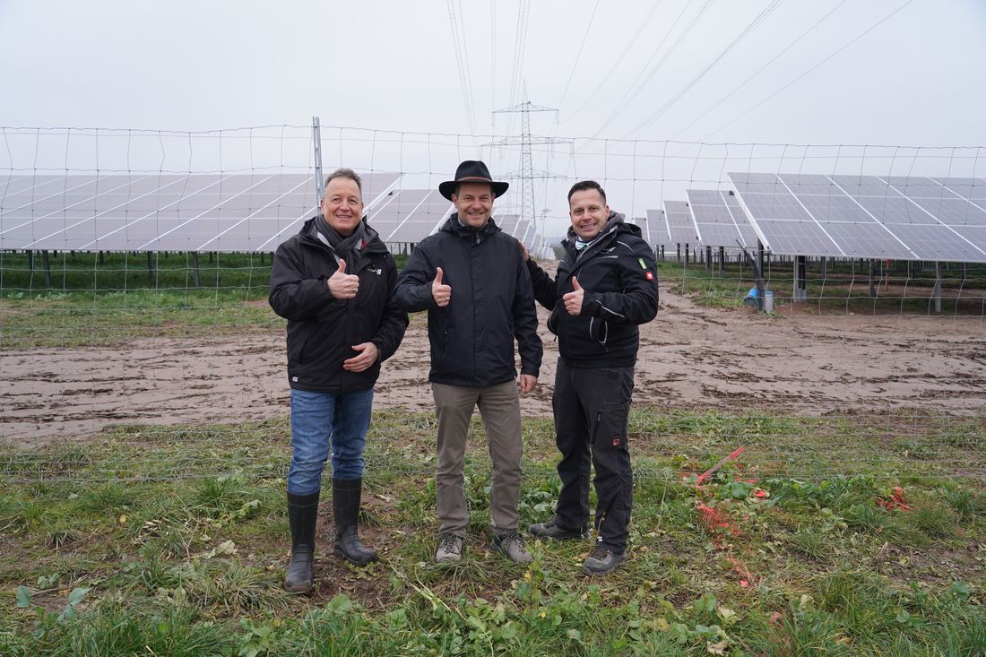 Das Sonnenkraftwerk Somborn ist am Netz. Bürgermeister Dr. Albrecht Eitz (Mitte), Thomas Ott (links) und Torsten Eurich von der Next Energy GmbH haben den Solarpark in Betrieb genommen.