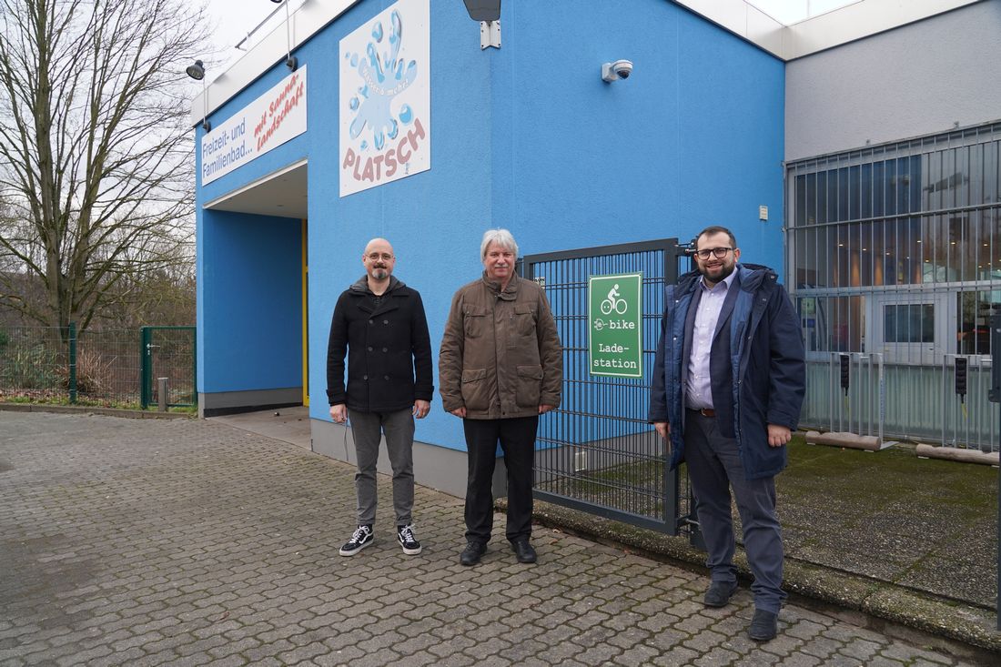 Bürgermeister Waldemar Gogel (rechts), Badleiter Ralf Ziola (links) und Eigenbetriebsleiter Volker Möbus vor der neuen E-Bike Ladestation am Freizeitbad Platsch.