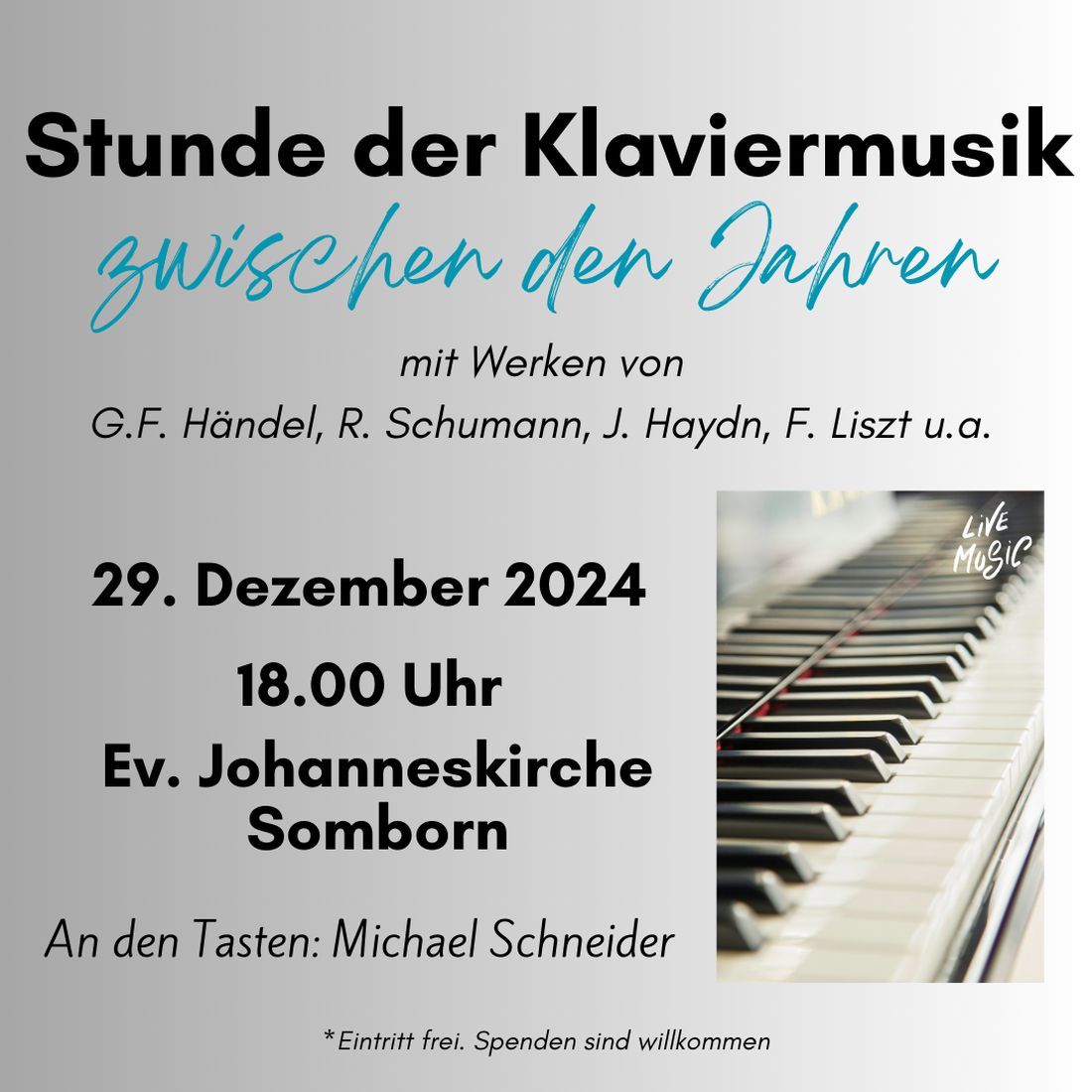 Am Sonntag, en 29. Dezember, findet in der Evangelischen Johanneskirche Freigericht-Somborn um 18 Uhr wieder eine "Stunde der Klaviermusik" statt.