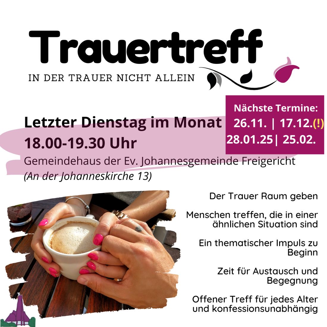 In der Trauer um einen Verstorbenen nicht allein zu sein, der Trauer Raum zu geben, Menschen zu treffen, die in einer ähnlichen Situation sind, und Zeit für Austausch und Begegnung zu haben – das ermöglicht der Trauertreff, zu dem die Evangelische Johannesgemeinde Freigericht trauernde Menschen einlädt.
