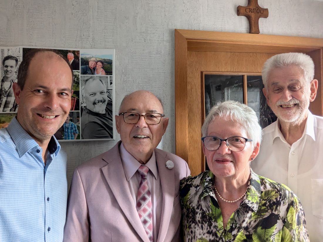 Das Ehepaar Hildegard und Rudolf Naumann nimmt zur Diamantenen Hochzeit Glückwünsche von Bürgermeister Dr. Albrecht Eitz (links) sowie Hugo Klein, Kreisausschussmitglied, entgegen.