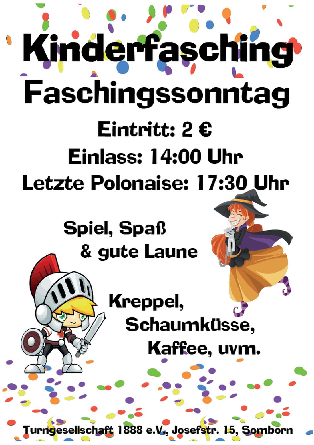 Der Kinderfasching bei der TGS Somborn findet am Faschingssonntag (15.02.2026) von 14.00-17.30 Uhr in der vereinseigenen Turnhalle in der Josefstraße 15 in Somborn statt.