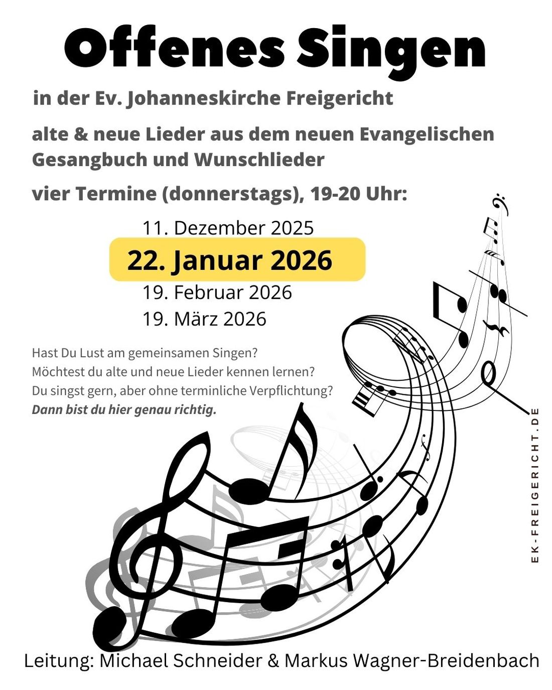 Am Donnerstag, 22. Januar, um 19 Uhr lädt die Evangelische Johanneskirche Somborn zum „Offenen Singen“ ein.