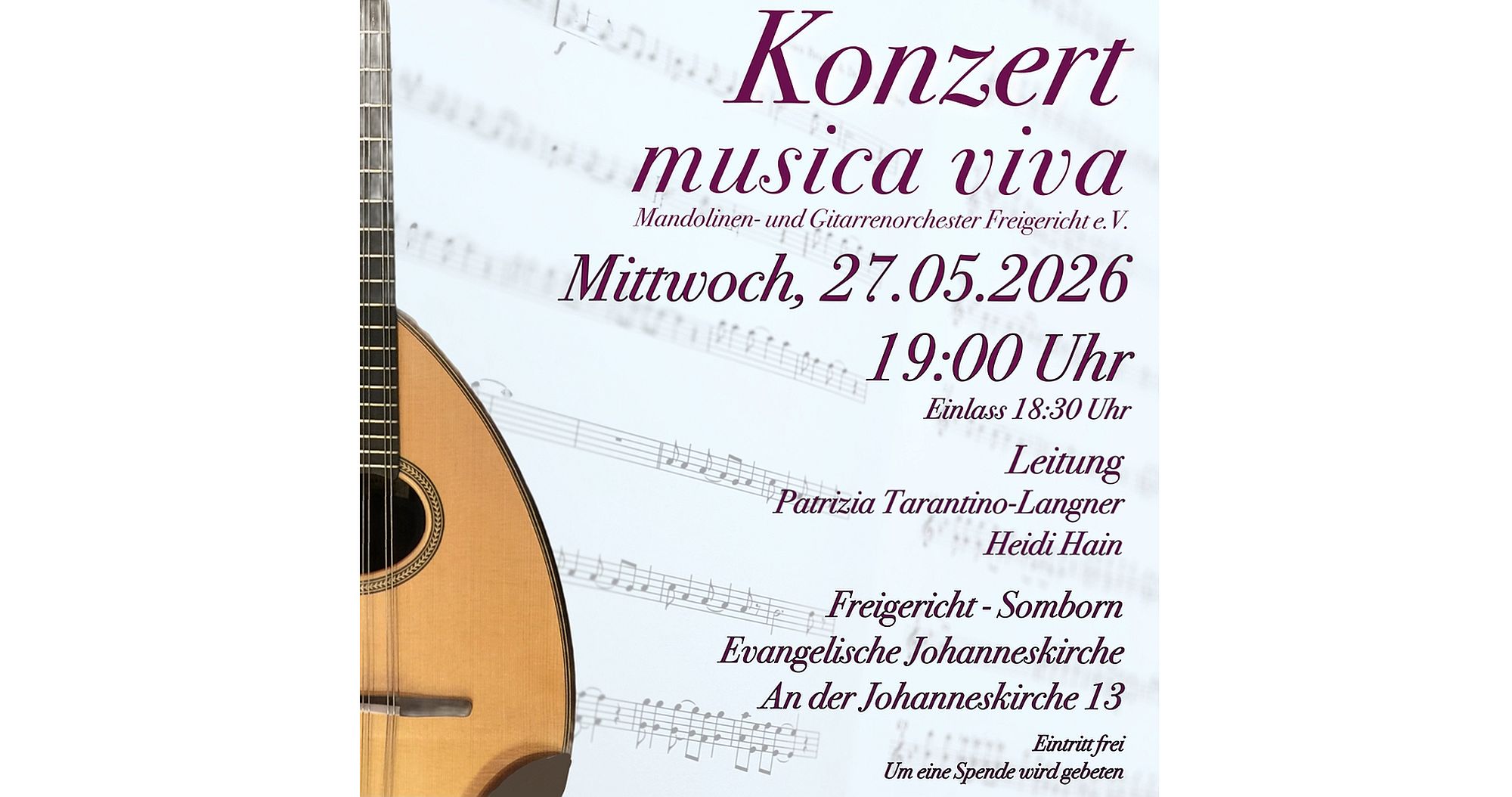 Eine kleine Auszeit vom Alltag, einfach einmal zuhören, genießen und die Seele baumeln lassen. Das ist in Kürze möglich. Denn am Mittwoch, 27.05.2026 um 19.00 Uhr findet in Freigericht-Somborn in der Johanneskirche ein kleines und feines Zupfmusik-Konzert statt. Der Eintritt ist frei, über Spenden würde sich der Verein natürlich freuen. Einlass ab 18.30 Uhr.