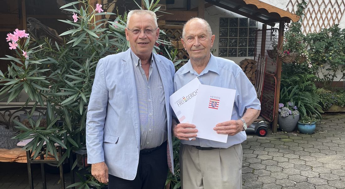 Herzliche Glückwünsche der Gemeinde überbrachte Gemeindevorstandsmitglied Bernd Hofmann (links) anlässlich des 90. Geburtstages von Otmar Hüttel.