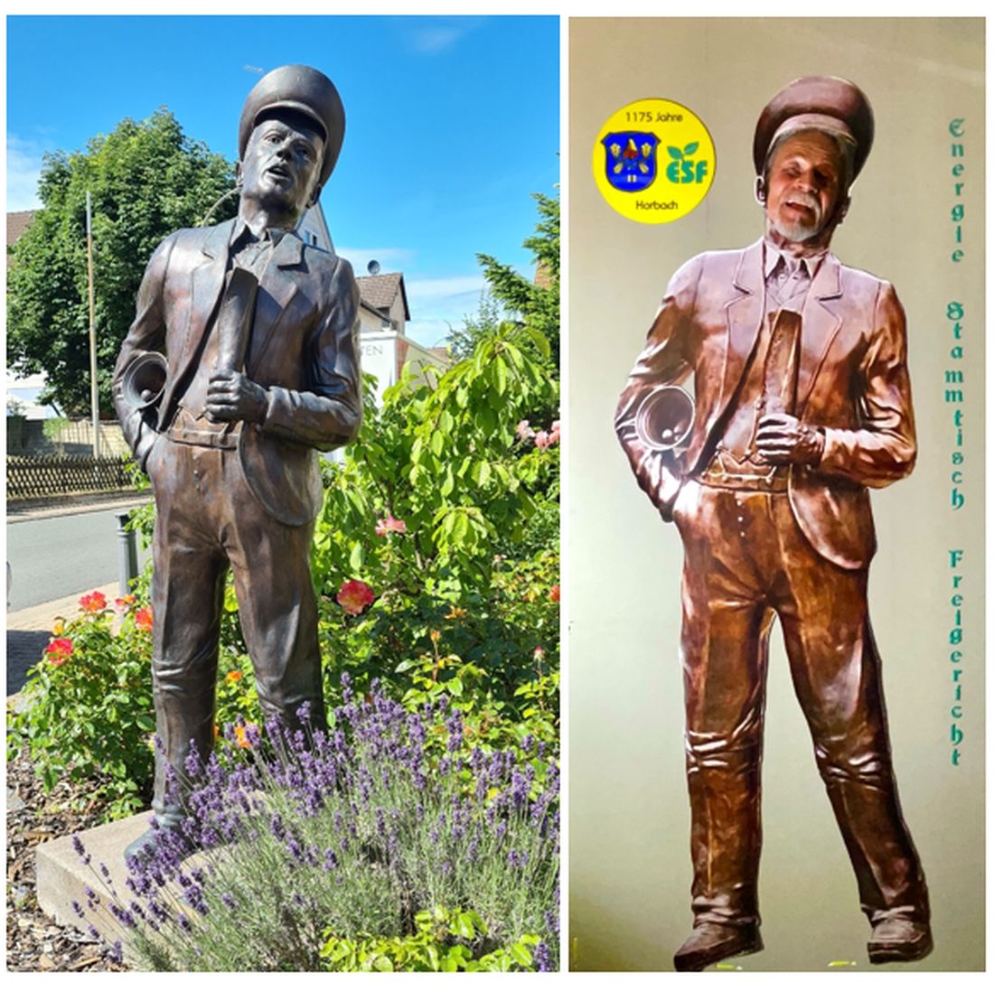 Bronzefigur des letzten „Ausrufers“. Das Original steht am Dorfplatz, die Fotowand für ein besonderes Erinnerungsbild ist am Stand des ESF aufgebaut. (Foto: Franz Josef Peter)