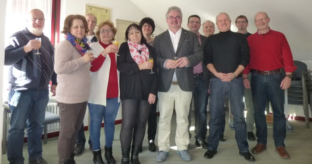 Foto: Der von Bürgermeister Joachim Lucas (3.v.r.) verabschiedete Michael Schneider (Bildmitte/6.v.r.) im Kreise der ehemaligen Kollegen.