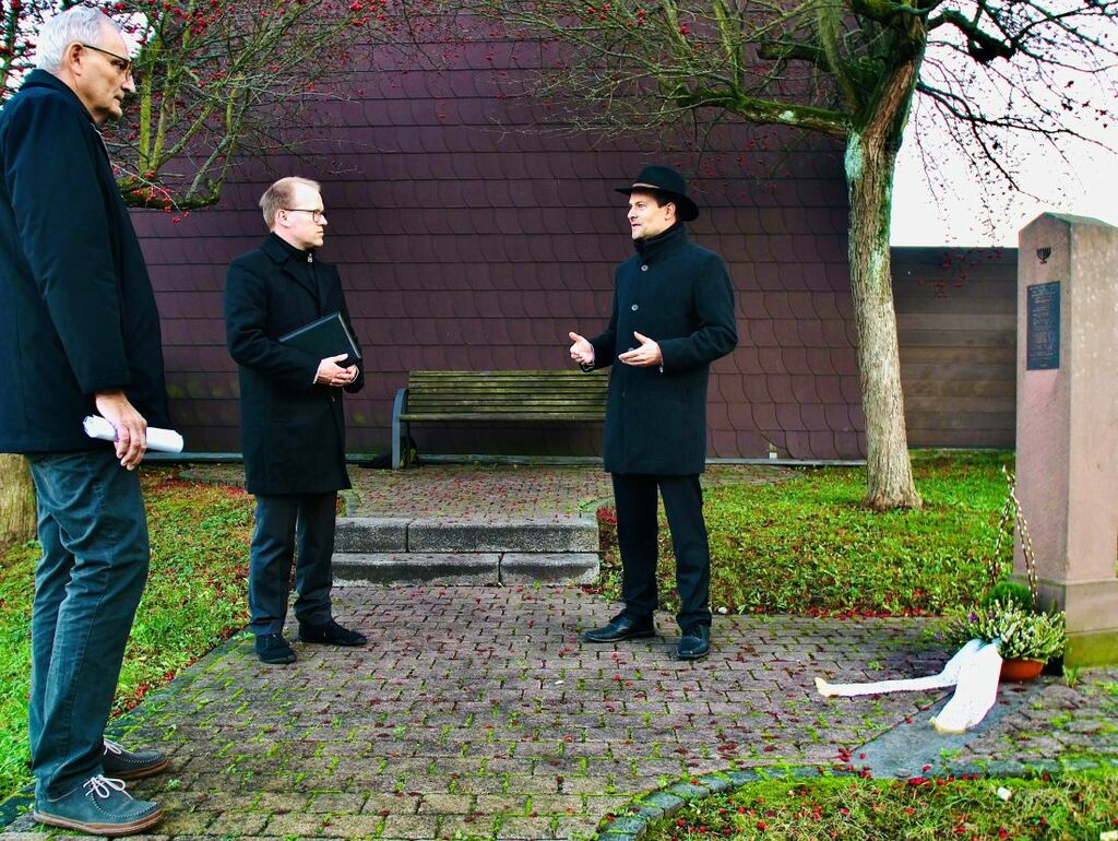 An der Stele in der Freigerichter Straße 28, dem einstigen Wohnhaus von Josef Sonneberg, erinnerte Bürgermeister Dr. Albrecht Eitz mit einer kurzen Ansprache an die ermordeten Jüdinnen und Juden aus Freigericht. Pastoralreferent i.R. Rudolf Schmitt und Pfarrer Markus Wagner-Breidenbach trugen gemeinsame Reflexionen und Gebete vor.