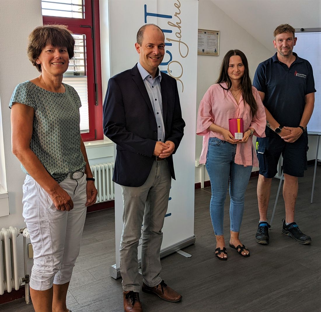 Der Dank des Bürgermeisters ging an alle Abteilungen, die Frau Alushi in verschiedenen Stationen breitgefächerte Verwaltungspraxis beigebracht hatten. Nun sei ein Lebensabschnitt erfolgreich abgeschlossen – mit einem sehr guten 13-Punkte-Ergebnis in der mündlichen Note. Ordnungsamtsleiter Peter Betz freute sich ebenfalls über den erfolgreichen Abschluss und hieß sie willkommen in seiner Abteilung. Hatixhe Alushi wird nun im Bürgerbüro und im Hauptamt eingesetzt. Glückwünsche überbrachte auch die Hauptamtsleiterin Diana Schöpf und wünschte alles Gute für die neuen Aufgaben. Patrick Haas vom Personalrat lobte das beachtliche Prüfungsergebnis und empfahl ihr, an Aufgaben zu wachsen und weiterhin für alle Tätigkeiten offen zu sein.
