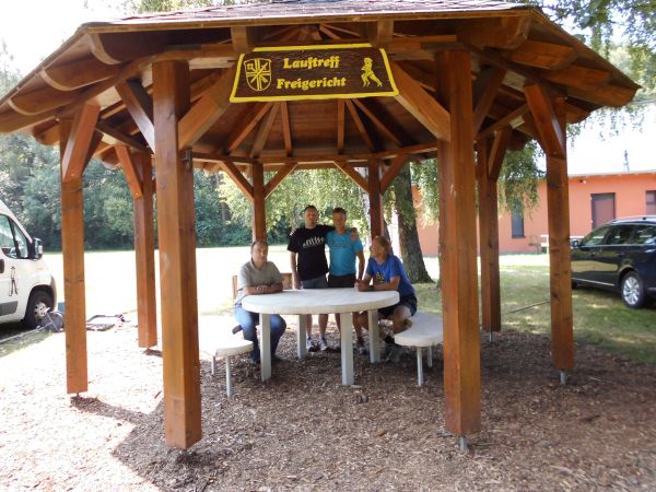 Nun wurde mit Hilfe der Gemeinde Freigericht, die das Fundament erstellte und der Unterstützung der Zimmerei Jochen Engel aus Kieselbronn im Kraichgau, die bereits den Entwurf und die Gestaltung der Hütte übernahm, der 2. Bauabschnitt mit einem runden Tisch und zwei Bänken vollendet. Tatkräftig mitangepackt haben erneut Jochen Engel, der dieses Mal nicht nur den Tisch und die zwei Bänke aufbaute, sondern auch das Material stiftete und die freiwilligen Helfer Robert Naumann (2. Vorsitzender, Manager des Jahres 2012 und Bauleiter), Klaus Fritz (Vorstandsvorsitzender), Malte Precht (Schriftführer), Jörg Emmerlich und Dr. Thomas Wegstein. Der Lauftreff Freigericht dankt außerdem Herbert Winkel, der die Füße von Tisch und Bänken stiftete und Thomas Wiedmann, der im letzten Herbst bereits die Dachspitze mit Blech verkleidet hat.