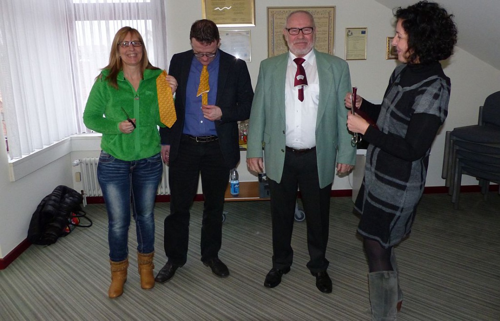 Christine Warburg vom Hauptamt (links) und Maria Horn von der Finanzverwaltung (rechts) legten kurzentschlossen am Donnerstag in der Mittagspause unter dem Applaus der anwesenden Verwaltungsmitarbeiter Hand an und walteten ihres der Weiberfastnacht üblichen Amtes: Schlips ab!