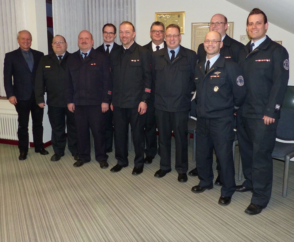 Foto (von links): Bürgermeister Joachim Lucas, die neuernannten und vereidigten Führungspersonen Alexander Froschauer (stellvertretender Gemeindejugendfeuerwehrwart), Norbert Kleiß (Gemeindejugendfeuerwehrwart), Timm Hofmann (stellvertretener Wehrführer Somborn), Jörg Haberkorn (Wehrführer Somborn), in der Mitte Gemeindebrandinspektor Harald Hellenbrandt; die verabschiedeten und entlassenen bisherigen Amtsinhaber Andreas Harth (Gemeindejugendfeuerwehrwart), Thomas Kraut (stellvertretender Jugendfeuerwehrwart), vorne Markus Germroth (Wehrführer Somborn), Fabian Moritz (stellvertretender Wehrführer Somborn).