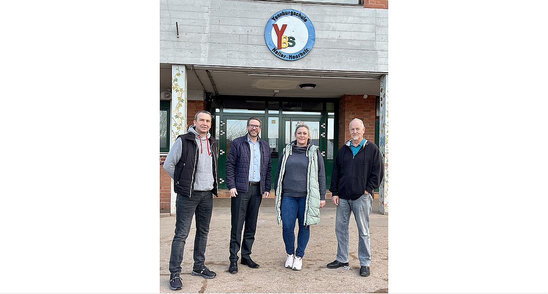 Der Main-Kinzig-Kreis investiert in den nächsten Jahren rund zwei Millionen Euro in die Ysenburgschule, um die Grundschule auch baulich „fit für den Ganztag“ zu machen. Ortsvorsteher Daniel Dietrich, Landrat Throsten Stolz, Susanne Kusch und Alexander Möller tauschten sich vor Ort darüber aus.