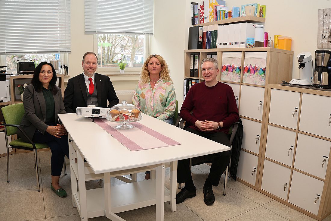Mehr Raum für Austausch, Erholung und zur Stärkung der Teamarbeit: Jane Kolczok, Bürgermeister Christian Litzinger, Aylin Burgucu und Marcel Pipa im neugestalteten Personalraum der Kita „Goethes Kinderwelt“. Foto: Stadt Gelnhausen