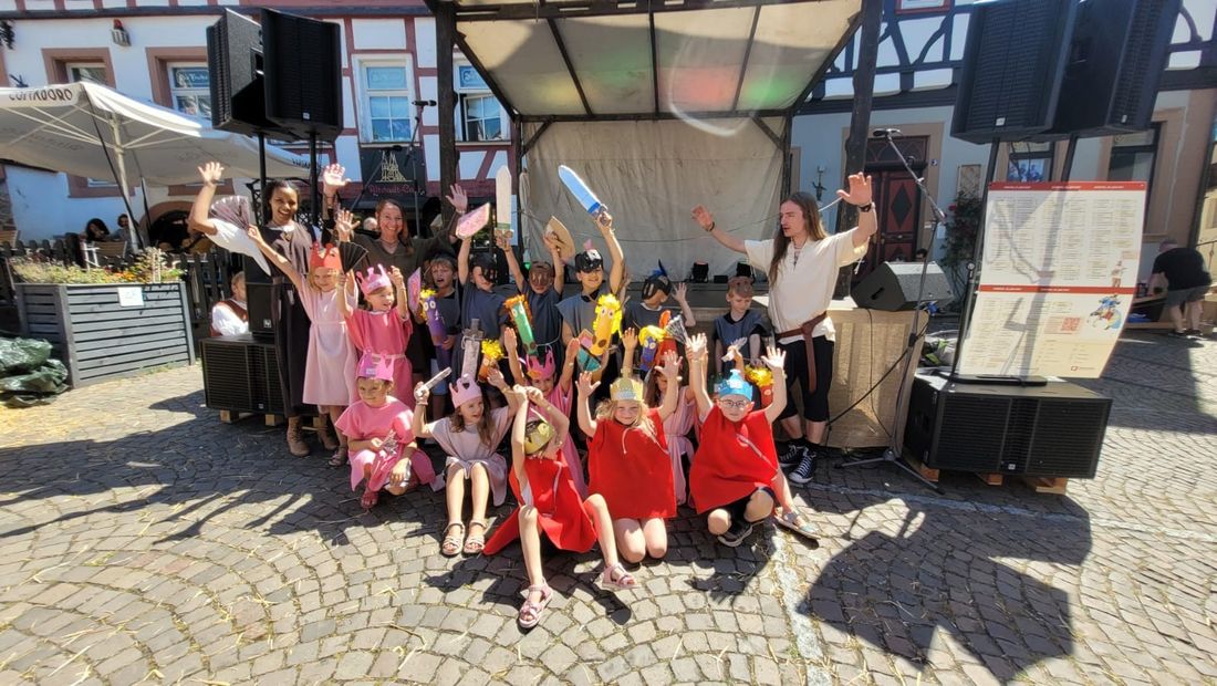 Die Vorschulkinder der „Höchster Frösche“ und das beteiligte Kita-Team freuen sich über eine gelungene Aufführung während der Historischen Stadtrechtsfeier in Gelnhausen. Foto: Stadt GN