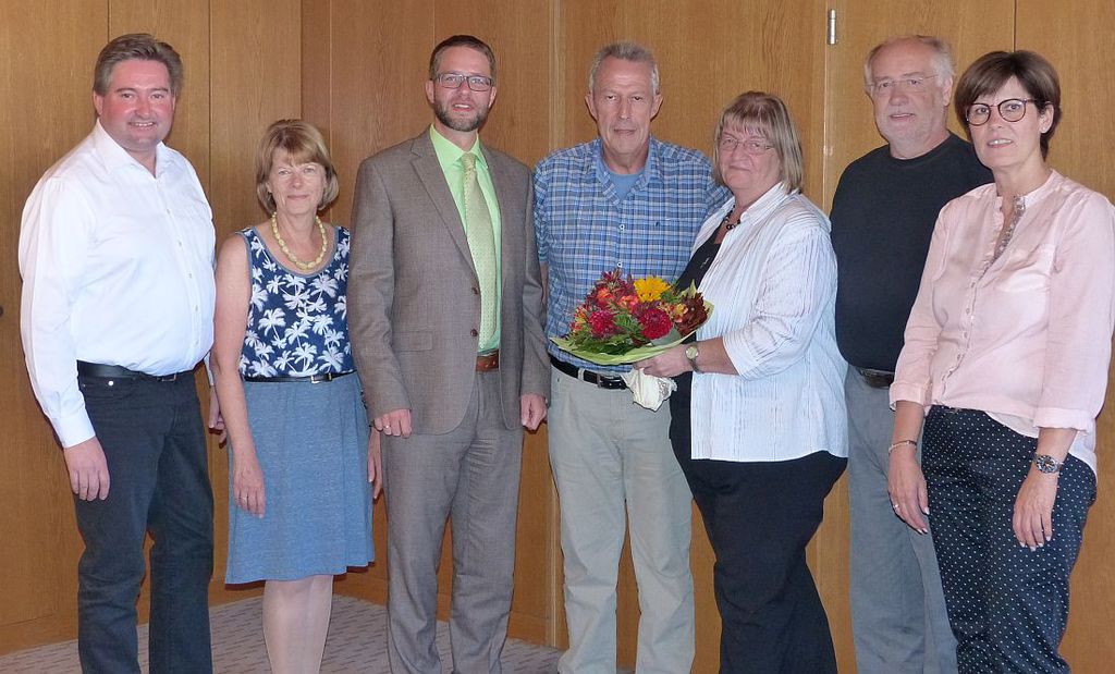 Foto (von links): Markus Krause (Liegenschaftsverwaltung), Marianne Baum (Fachbereichsleiterin Personal), Bürgermeister Thorsten Stolz, Lothar Krieg, Monika Lehnert (Personalratsvorsitzende), Günther Kauder (Bauamtsleiter) und Helga Spahn (Liegenschaftsverwaltung).