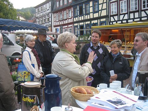 Gute Gespräche, heißen Kaffee und frische Schokobrötchen gab es bei der Aktion „Auf einen Kaffee mit Bürgermeister Thorsten Stolz“ auf dem Gelnhäuser Wochenmarkt.