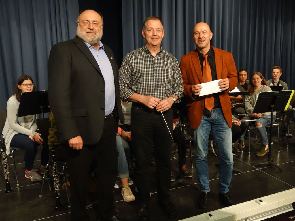 Der Kreisbeigeordnete Matthias Zach (links) hat in diesen Tagen sein Versprechen an der Kreisrealschule Gelnhausen eingelöst und einen Zuschuss für entsprechende T-Shirts der Musikklassen überreicht.