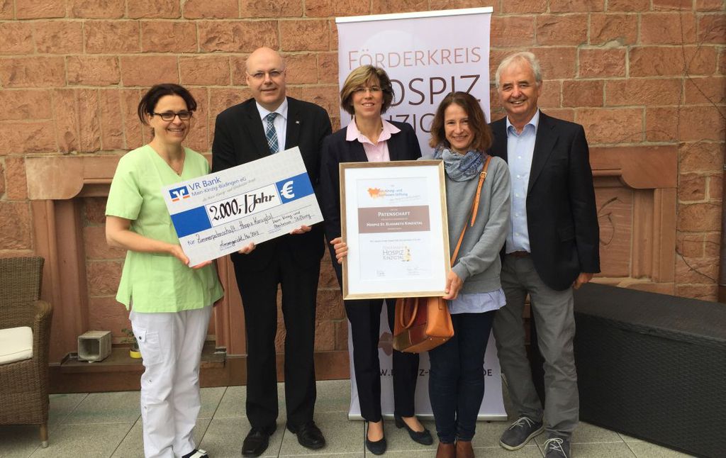 Foto: Guter Tausch: Urkunde gegen Scheck. Die stellv. Hospiz-Leiterin Ursula Schlereth, die Stiftungs-Vorstände Norbert Ross und Petra Kalbhenn sowie die Förderkreis-Vorstände Antje Kornhuber und Rolf Heggen auf der Terrasse des Hospizes in der Gelnhäuser Holzgasse.