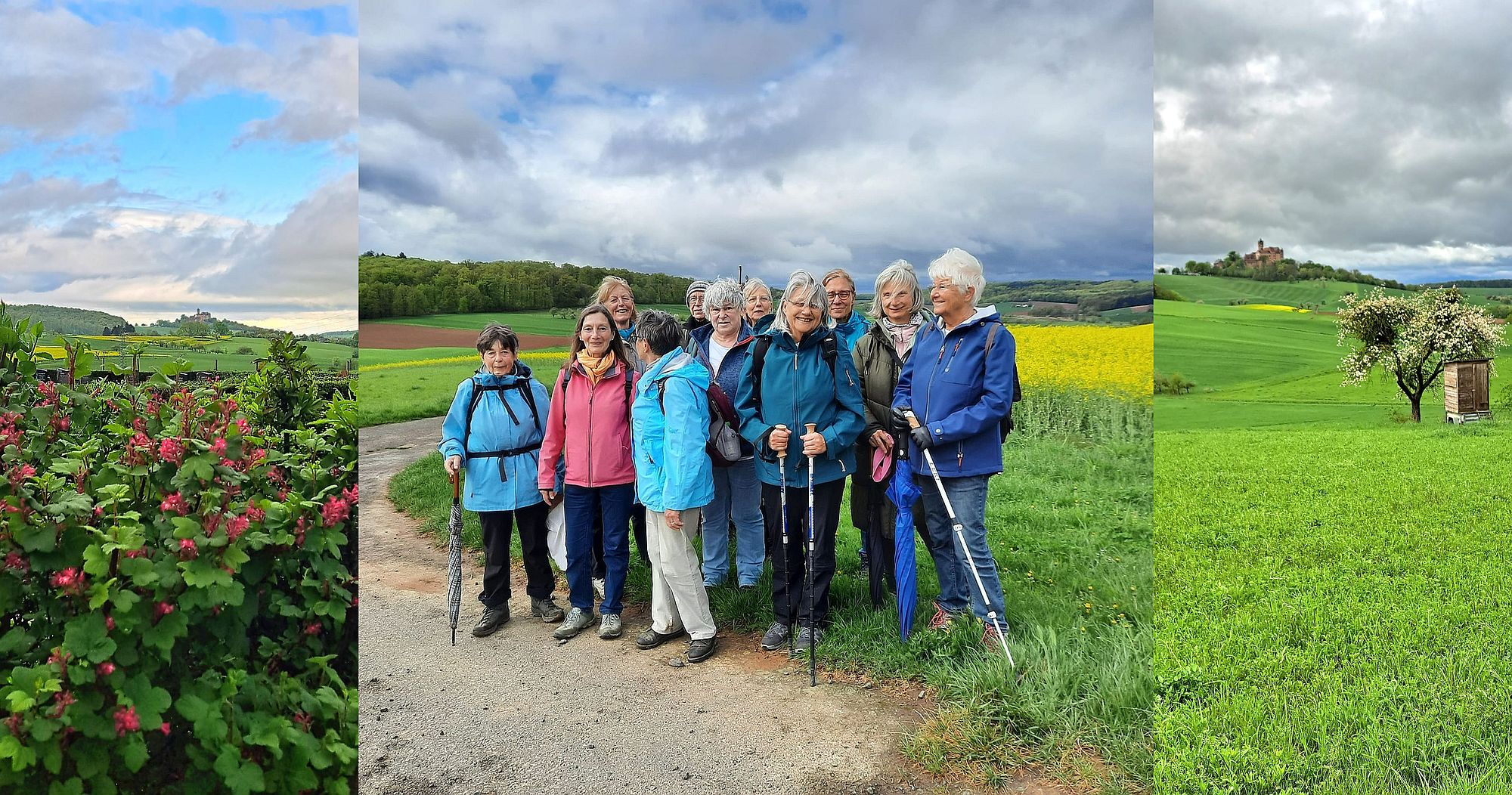 Diese wurden belohnt, denn nur nach einer halben Stunde Regen, wurde es klar und die Sonne ließ aufblühende Landschaft entlang der Ronneburg im Büdinger Hügelland in klarer Luft und tollem Licht erscheinen. Die 10 Kilometer lange Strecke mit zwei leichten Steigungen führte über das Hofgut Herrnhaag durch Felder und Wiesen, über Diebach und Vonhausen wieder zurück zum Ausgangspunkt am Parkplatz.