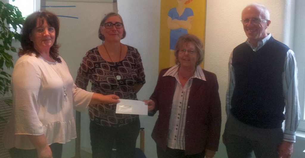 Foto: Behördenbegleiterin Krista Wurche (2. von rechts) überreicht Roberta Bandel (links) den Bewilligungsbescheid für LAWINE.