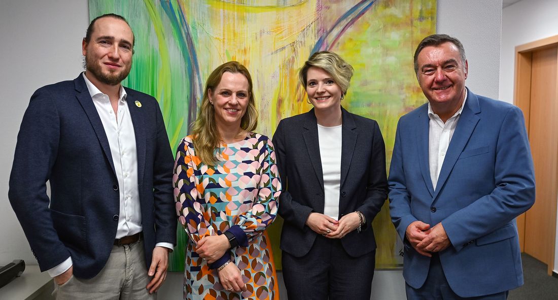 Von links: Michael Bergmann, Irene Smak, Bürgermeisterin Theresa Neumann, Schuldezernent Jannik Marquart, Max Schad.