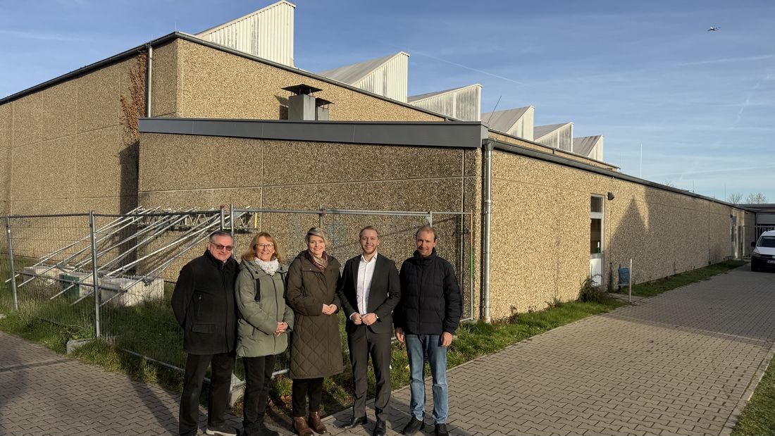 Zu einem vor Ort Termin an der Sporthalle der Geschwister-Scholl-Schule kamen der für die Liegenschaft zuständige Schuldezernent Jannik Marquart (CDU), Bürgermeisterin Theresa Neumann (CDU) und die CDU-Fraktionsmitglieder Max Schad, Irene Smak und Michael Bergmann zusammen.
